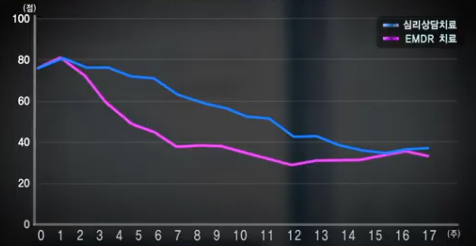 EMDR은 안구(Eye) 운동(Movement) 탈감각(Desensitiztion) 및(and) 재처리(Reprocessing)을 뜻합니다. 다시 말하면, 트라우마를 겪었던 내담자들에게 상담사와 치료자가 손가락을 쳐다보게 하는 기법입니다. 이 EMDR 치료법에 대해 많은 증거들이 있습니다. 2012년도에 영국 정신과학회지에는 간단한 심리상담치료와 안구운동 민감 소실 및 재처리 요법의 치료효과(Brief eclectic psychotherapy v. eye movement desensitisation and reprocessing therapy for post-traumatic stress disorder: randomised controlled trial)라는 논문이 발표되었습니다. 이 외에도 수많은 증거들이 존재합니다.
