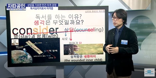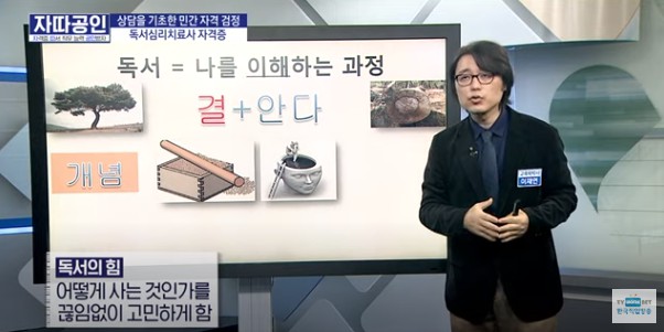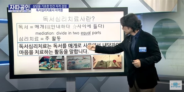이 영상은 제가 한국 직업 TV에서 방송파는 자따공인 프로그램 방송을 했던 사진입니다. 혹시 영상으로 보고 싶은 분들은 유튜브에서 '자따공인 독서심리치료사'라고 검색하시면 보실 수 있습니다. 하지만!! 영상은 나중에 보시더라도 꼭 알아야 하는 독서심리치료사에 대한 부분은 이 글을 다 읽으시면 제대로 알 수 있으실 겁니다. 저도 독서심리치료사에 대한 내용을 이번 글로 마무리하려고 합니다. 다음 글들은 그냥 꾸준히 실제 내용만 적도록 하겠습니다. 저도 코로나 사태로 시간이 생각보다 많이 남아서 이렇게 글을 자주 올릴 수 있게 되었지만, 또 코로나 상황이 사라지면 강의와 상담하느라 이렇게 티스토리에 정리해서 올릴 시간이 없을 것 같습니다. 그래도 이렇게 한 번 적을 때 제대로 정보를 올려놓아야 많은 분들이 독서심리치료사에 대해서 오해도 없을 것이고 정확하게 무엇을 공부해야 하는지 알게 될 것이라고 생각합니다. 그런 의미에서 최선을 다해서 정리해해 보도록 하겠습니다.