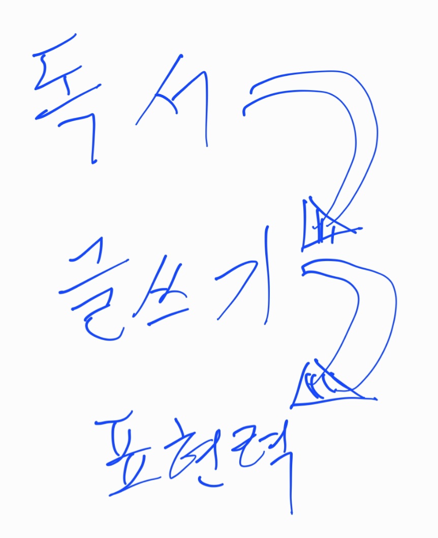 독서를 먼저 해야 생각이 생기고 그 생각을 글쓰기로 표현하는 습관을 가지게 해야 합니다. 독서를 한 후 그냥 책을 덮어 버린다면, 절대로 글쓰기로 이어지지 않습니다. 독서 중간에 글쓰기를 하는 단계도 있지만 이것은 상당 수준이 되어야 가능한 일입니다. 대부분은 일정량을 읽은 후에 그 느낌과 생각 그리고 그 내용에서 도출되는 깨달음을 글로 적는 것이 글쓰기 훈련입니다. 이렇게 집중을 넘어선 '초집중'을 해야 독서와 글쓰기가 가능해집니다.